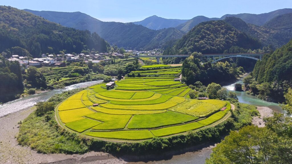 清水地区を代表する風景が、扇状に広がる棚田「あらぎ島」です。山々に囲まれた谷あいに広がる田んぼは、春は水鏡に空を映し、夏は青々とした稲が風にそよぎ、秋は黄金色に輝き、冬は静かな雪景色と、四季それぞれに表情を変えます。